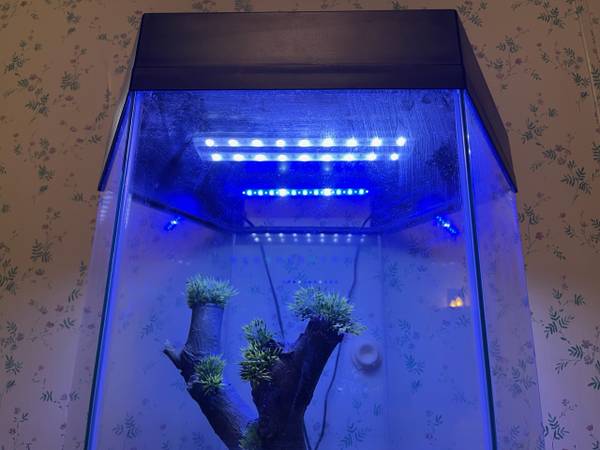 Octagonal fish tank! It includes gravel and the decor inside. Just the center piece alone cost over our selling price. The plastic plants and gravel are super expensive these days too. What’s really cool about this tank are the led lights inside. The back row of lights are blue and can be changed to different settings. I’m not sure how many gallons the tank is but at least 20 gallons plus. It’s a great setup for fish or reptiles as well with some changes. Included is a nice quality thermometer and a pump, you’ll need filters for it. Priced to sell for only 50.00 dollars. You’ll need to carry it out, it is heavy. Cash sale only and local pickup only. Everything sold in as is condition, you can check it out.